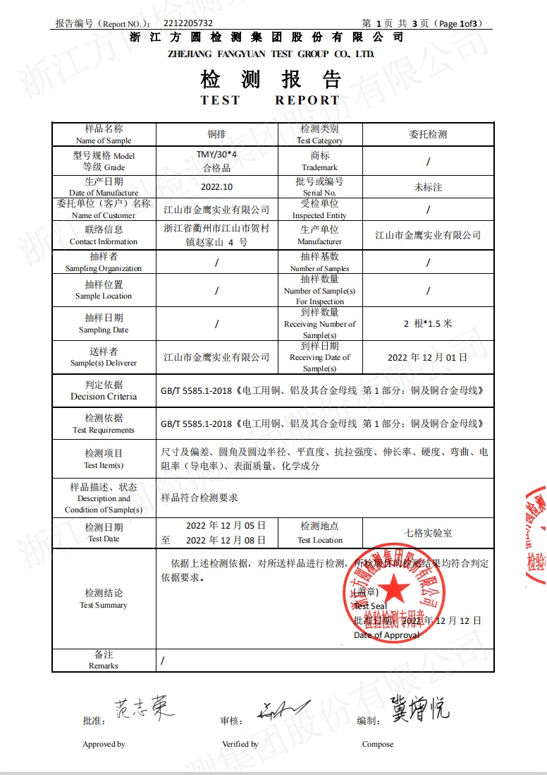 江山市金鷹實業有限公司,地處江山市賀村工業園區趙家山4-1號,占地面積18000M2,建筑面積約15000 M2。原主要生產、銷售“金鷹、金盾、JYD”系列地彈簧產品,是國內唯一二次參與制訂地彈簧國家標準的專業生產廠。企業曾榮獲“省級先進企業、文明單位”等殊榮。所生產的系列地彈簧產品,被國家及省有關部門評定為“省優產品、質量信得過放心產品、高標準嚴要求制造產品”等稱號。并于2002年通過了“ISO9002方圓質量體系認證”。隨著國內用電水平的不斷提高及高低壓電網改造的需要,公司及時捕捉市場對電工銅排和紙包繞組銅扁線需求的機遇。通過自籌資金,改建廠房,新購成套先進生產、檢測設備。建成了目前國內自動化程度最高,加工精度最優的電工銅排和紙包繞組銅扁線生產線。